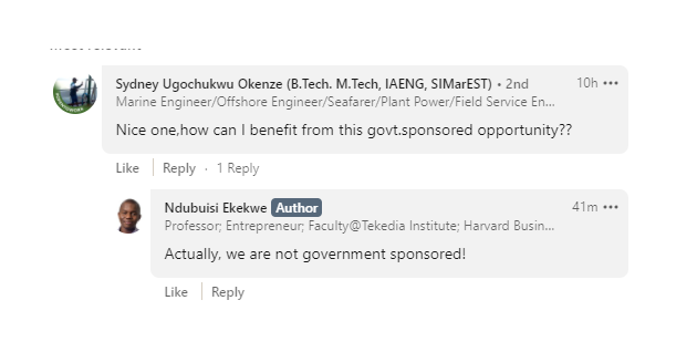 Good People, we appreciate the interests. But let me make it clear that Tekedia programs are not government sponsored. Like this comment here, it is popping up everywhere and our emails that our programs are government sponsored. No, we are sponsored by the people and not the government. Sure, we do offer many scholarships but that some attend free does not mean this is a government program.