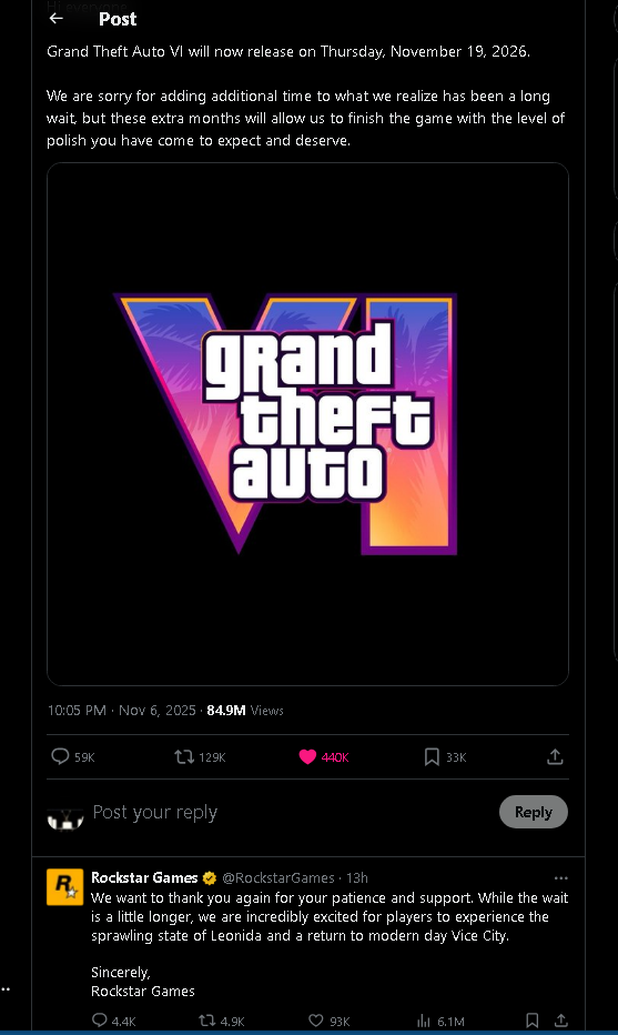 The release date for Grand Theft Auto VI has been delayed to November 2026, after initially being rescheduled from fall 2025 to May 2026.