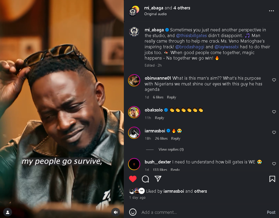 Nigerian rapper MI Abaga, better known by his stage name Mr. Incredible, captioned the Instagram collaboration visual that was uploaded on July 5th, 2025. "Sometimes you just need another perspective in the studio, and @thisisbillgates didn’t disappoint. 🎵 Man really came through to help me crack Ms. Veno Marioghae’s inspiring track! @brodashaggi and @layiwasabi had to do their jobs too. 🏍️ When good people come together, magic happens - Na together we go win! 🔥"
