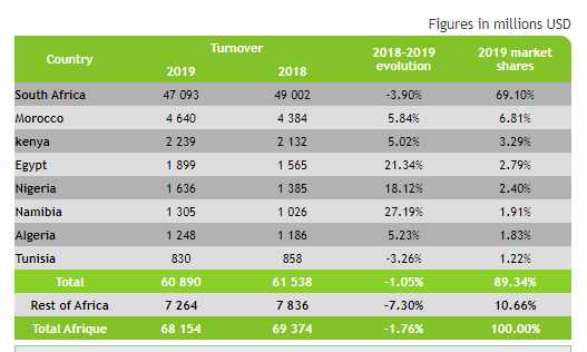 In Africa , the largest markets in terms of turnover are South Africa (69.10%), Morocco (6.81%), Kenya (3.29%), while in terms of the development of insurance (density) , the largest markets are South Africa, Morroco, Namibia.
