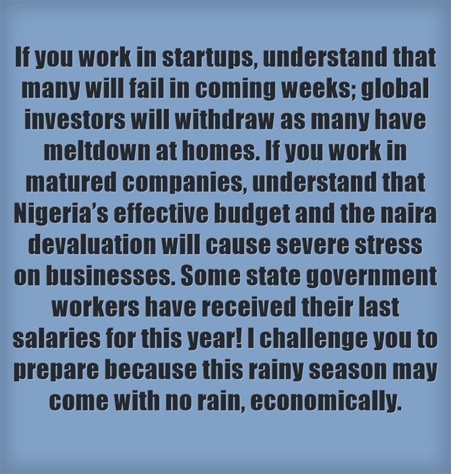 If you work in startups, understand that many will fail in coming weeks; global investors will withdraw as many have meltdown at homes. If you work in matured companies, understand that Nigeria’s effective budget and the naira devaluation will cause severe stress on businesses. Some state government workers have received their last salaries for this year! I challenge you to prepare because this rainy season may come with no rain, economically.