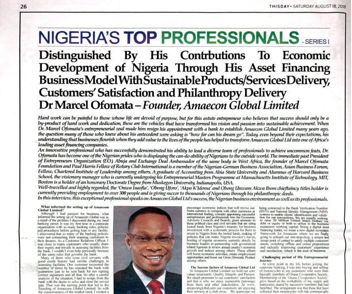 ThisDay (Saturday Aug 18 2018) has recognized the CEO of Amaecom Global (Marcel Ofomata) as one of Nigeria's Top Professionals for his contributions to economic development of Nigeria through his pioneering asset financing business. Fasmicro Advisory is a lead advisor to Amaecom Global as it pursues its continental vision. Amaecom has more than two dozen branches in Nigeria with operations in Cameroon, Ghana, etc.