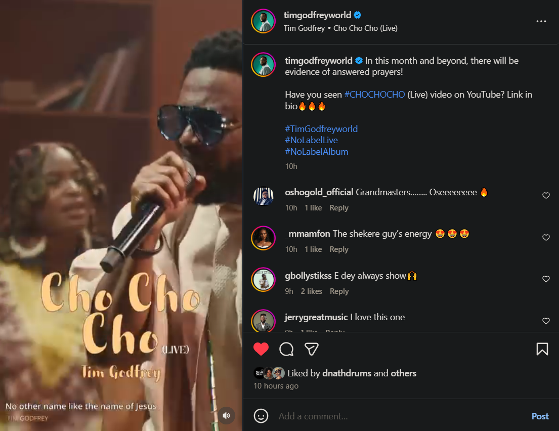 Tim Godfrey's most recent Instagram post, "In this month and beyond, there will be evidence of answered prayers," is a statement full of trust. Alongside it, he expressed delight about his new live performance video, #CHOCHOCHO (Live), and urged people to watch it on YouTube by clicking the link in his bio.
