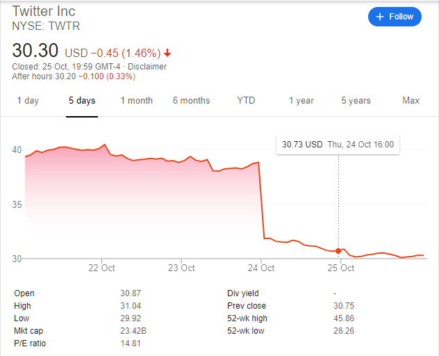 Quote from Ndubuisi Ekekwe on October 27, 2019, 8:47 AMAmazon and Twitter both suffered heavy share-price drops (6.6% and 20.8% respectively) following the release of their results. Stung by rising shipping costs, Amazon disappointed analysts with EPS of $4.23 rather than $4.62, and irked investors with poor revenue guidance for the holiday season. Twitter reported revenues of $823.7 million rather than the expected $874 million, notes Fortune.