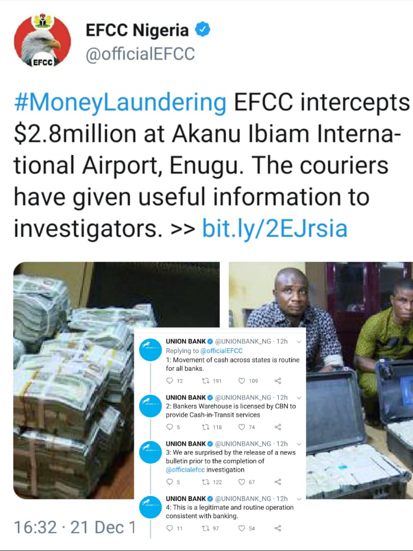 Quote from Ndubuisi Ekekwe on December 21, 2018, 7:12 PMEFCC picked some "money launderers" who confessed they were working for Union Bank. Apparently, it seems EFCC does not understand the law on cash movement. There was no own-goal scored by Union Bank as what it was doing here via its partner seems legitimate: moving cash by banks is not a crime (read the response, PDF)