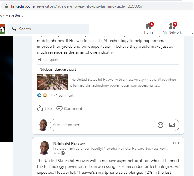 Good People, our insight on Huawei and its new quasi-pivot to pig farming made LinkedIn News Editors’ pick. Thank you so much for making this feed very impactful. We are now a regular there.
