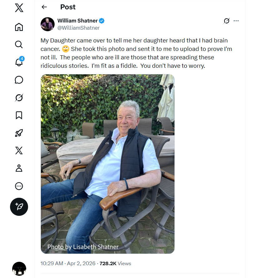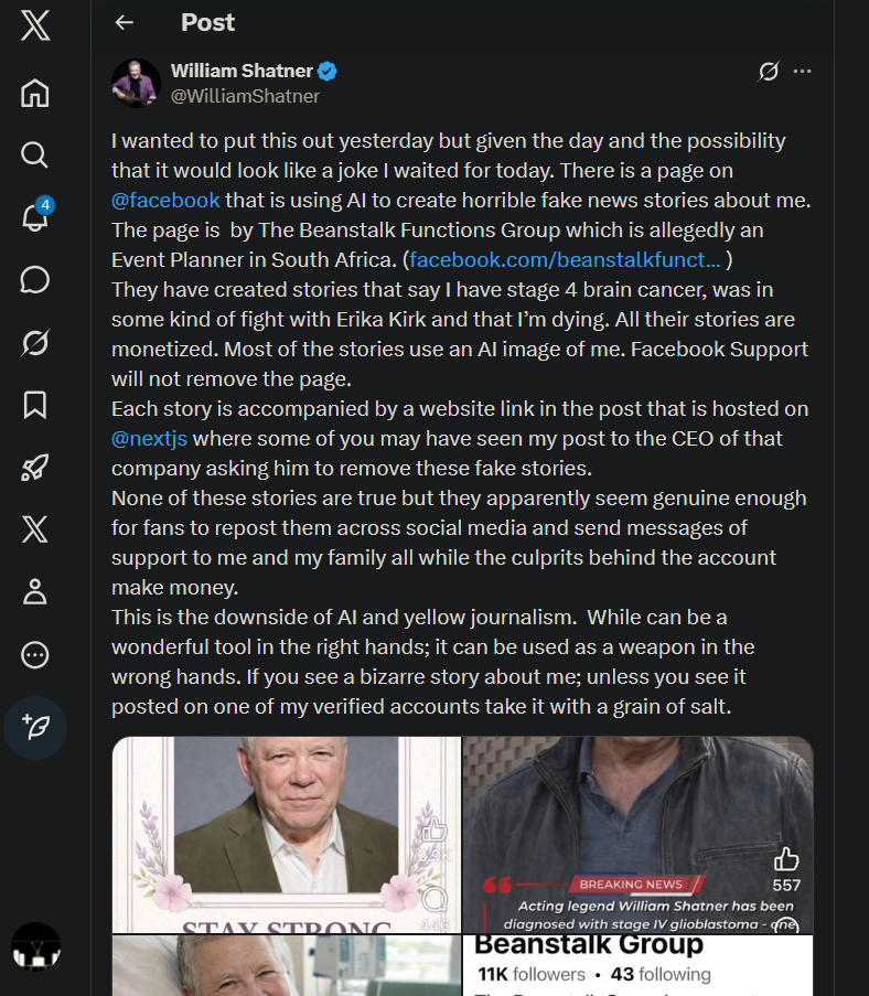 "They have created stories that say I have stage 4 brain cancer," on April 2, Shatner posted on X (previously Twitter), "and that I’m dying. All their stories are monetized. Most of the stories use an AI image of me."
