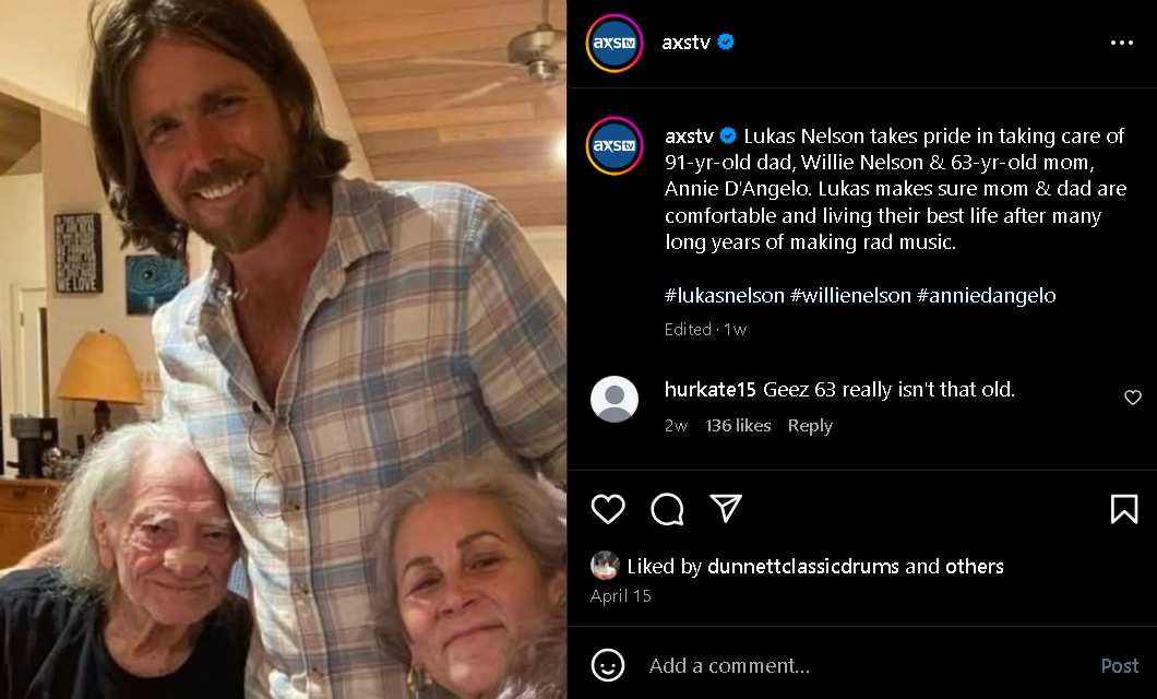 "Lukas Nelson takes satisfaction in taking care of 91-year-old dad, Willie Nelson & 63-year-old mom, Annie D'Angelo," AXS TV said with the adorable family photo.