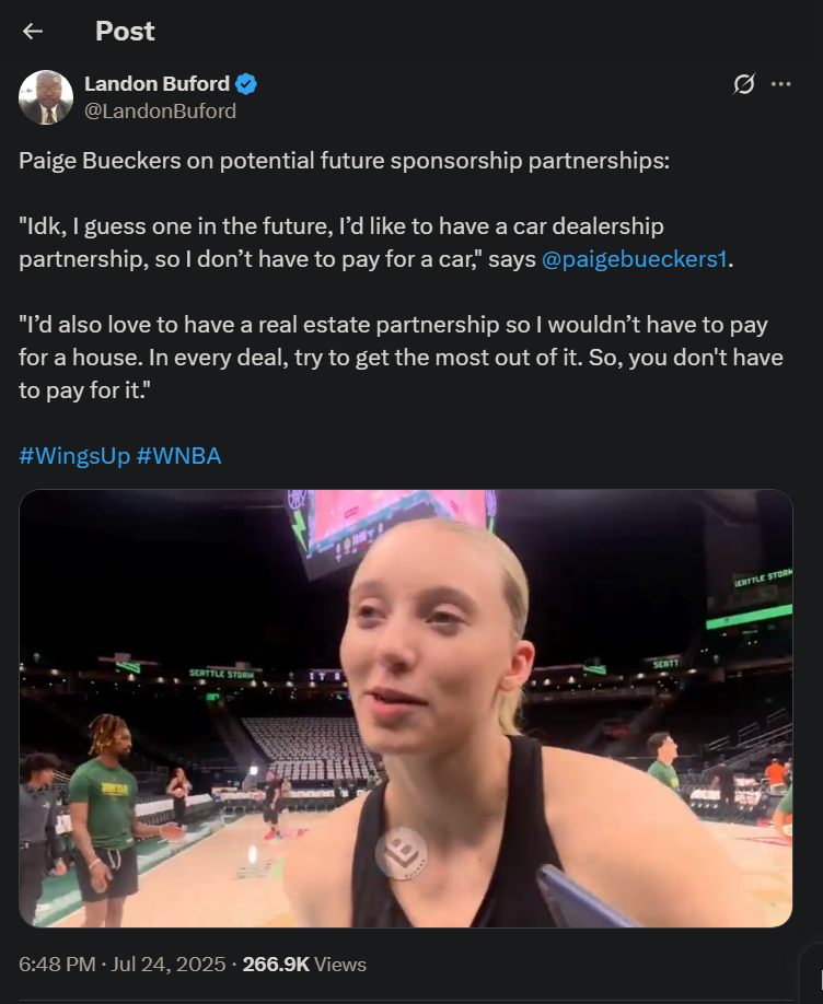 When Bueckers informed a reporter in July that she would “like to have a car dealership partnership, so I don’t have to pay for a car.” she may have been expressing this strategy.