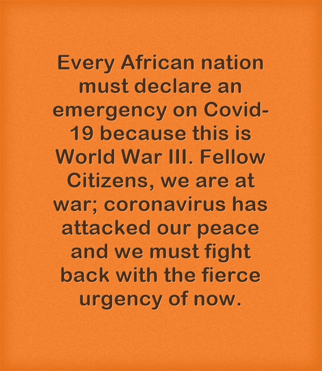More so, every African nation must declare an emergency on Covid-19 because this is World War III. Fellow Citizens, we are at war; coronavirus has attacked our peace and we must fight back with the fierce urgency of now.