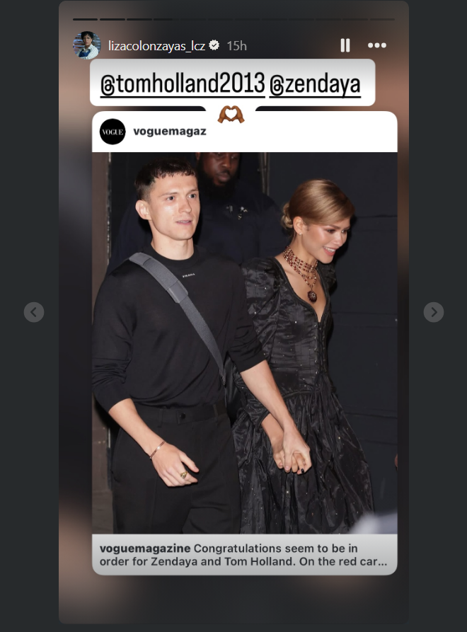 Liza Colón-Zayas, who costarred with Tom and Zendaya in the upcoming Spider-Man: Brand New Day, recently declared her affection for the duo. On March 6, the Emmy winner uploaded an item on the couple's marriage to her Instagram Story, tagging the 29-year-olds and adding an emoji of hands creating a heart.