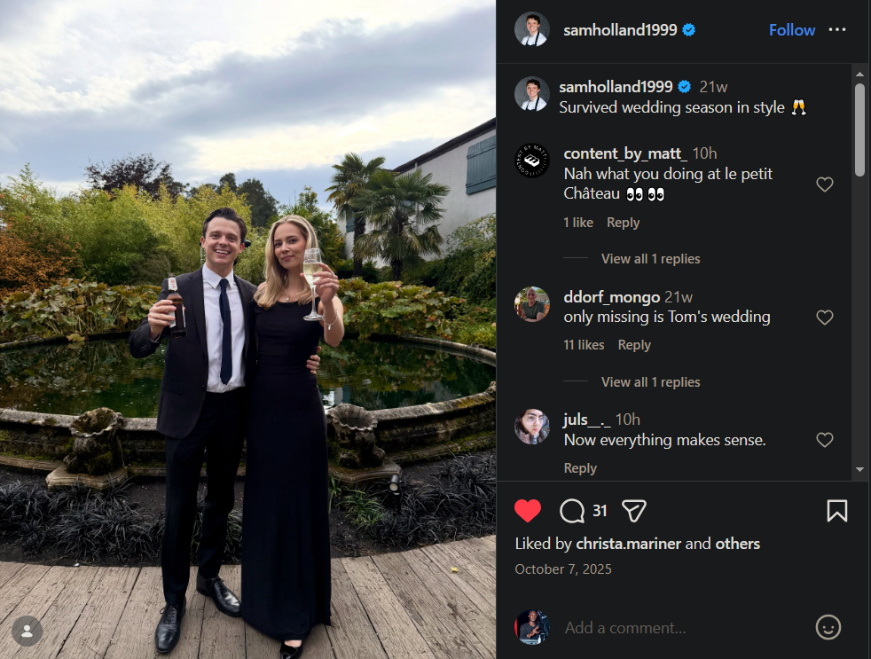 Sam Holland, Tom's brother, did, in fact, attend a wedding last year, as many quickly pointed out. On October 7, Sam posted a picture of himself and girlfriend Clark Stewart together at a celebration on Instagram with the remark, "Survived wedding season in style."