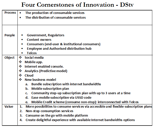 “Innovation happens when the basis of competition moves”… Professor Ndubuisi Ekekwe. I put together insights from the ongoing Tekedia mini-MBA program to craft this strategy map for DStv using the four cornerstones of innovation developed by my faculty Aderinola Oloruntoye. The idea here is to grow the consumer base of DStv by utilizing new revenue models and through digital execution. John Ugbe I am glad to be participating in the ongoing Tekedia mini-MBA program. (From Chinedu Onuegbu at LinkedIn)