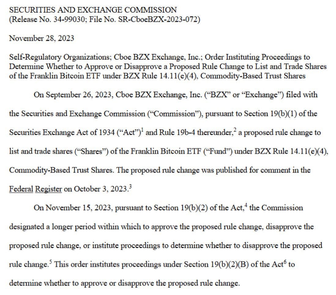 The US Securities and Exchange Commission (SEC) has postponed its decision on whether to approve a spot Bitcoin exchange-traded fund (ETF) proposed by Franklin Templeton, one of the largest asset managers in the world. The SEC announced on Tuesday that it would extend the review period for the Franklin Bitcoin ETF Trust by another 45 days, pushing the deadline to January 26, 2022.