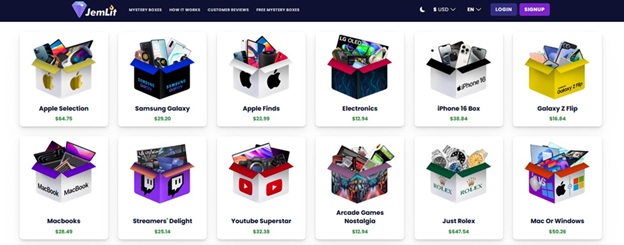 One of the major reasons JemLit is well-rated by many is the manner in which it caters to varied tastes while preserving the core thrill of the unknown. It is packed with different kinds of products spread across various categories including gaming, fashion, crypto, jewels, sports, and many more.