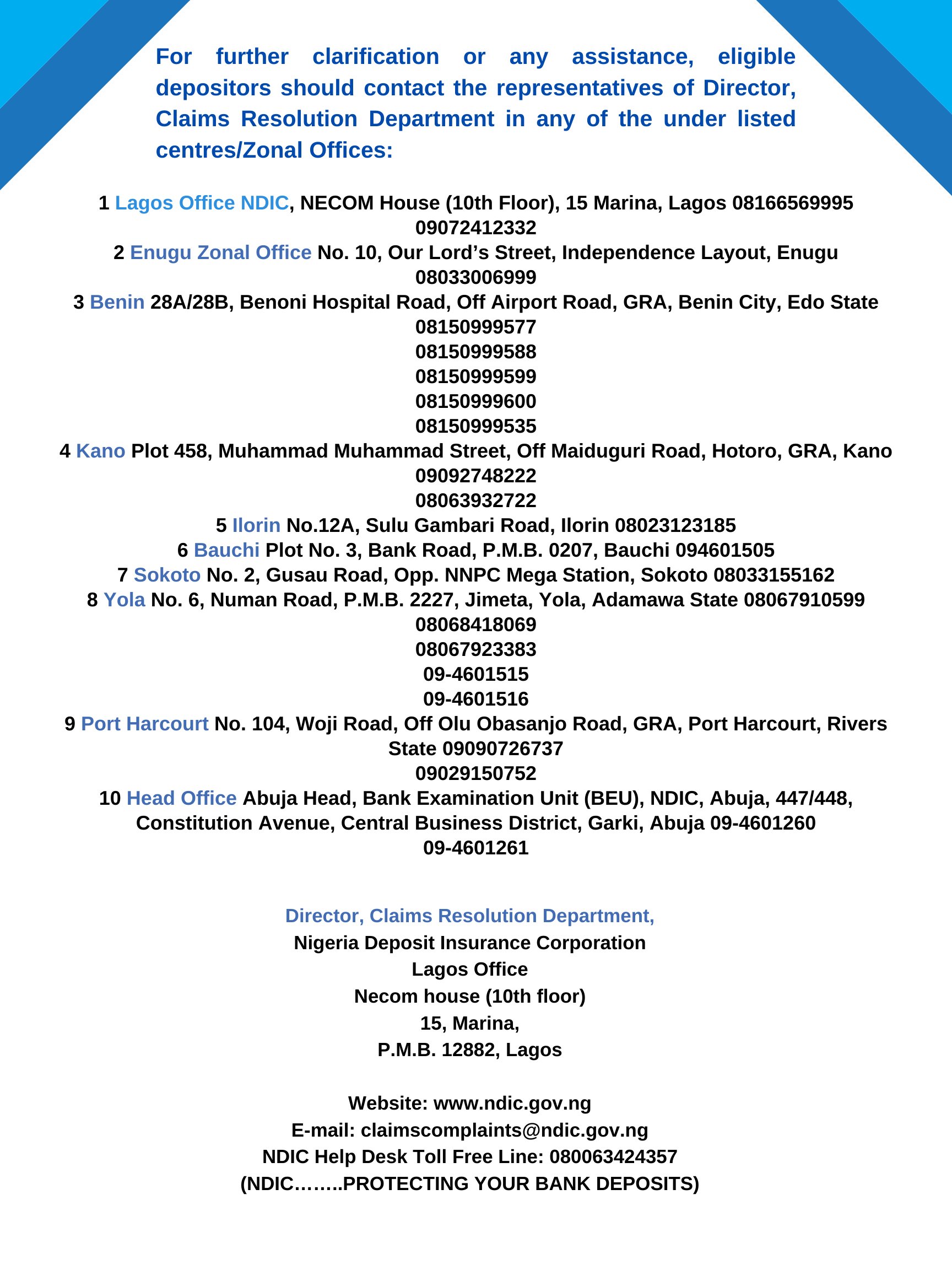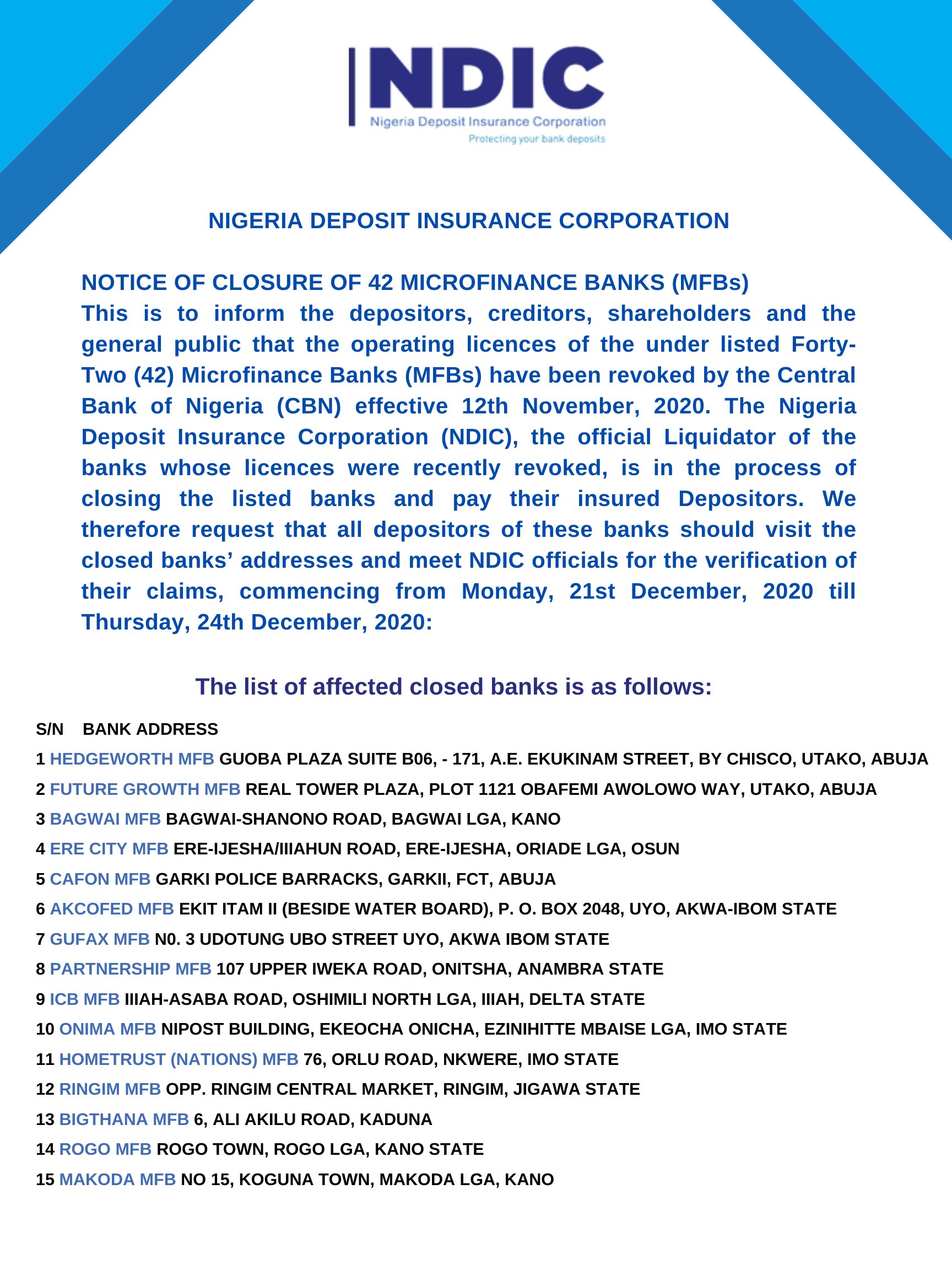 “The Nigeria Deposit Insurance Corporation (NDIC), the Official Liquidator of the banks whose licenses were recently revoked, is in the process of closing the listed banks and pay their insured Depositors.