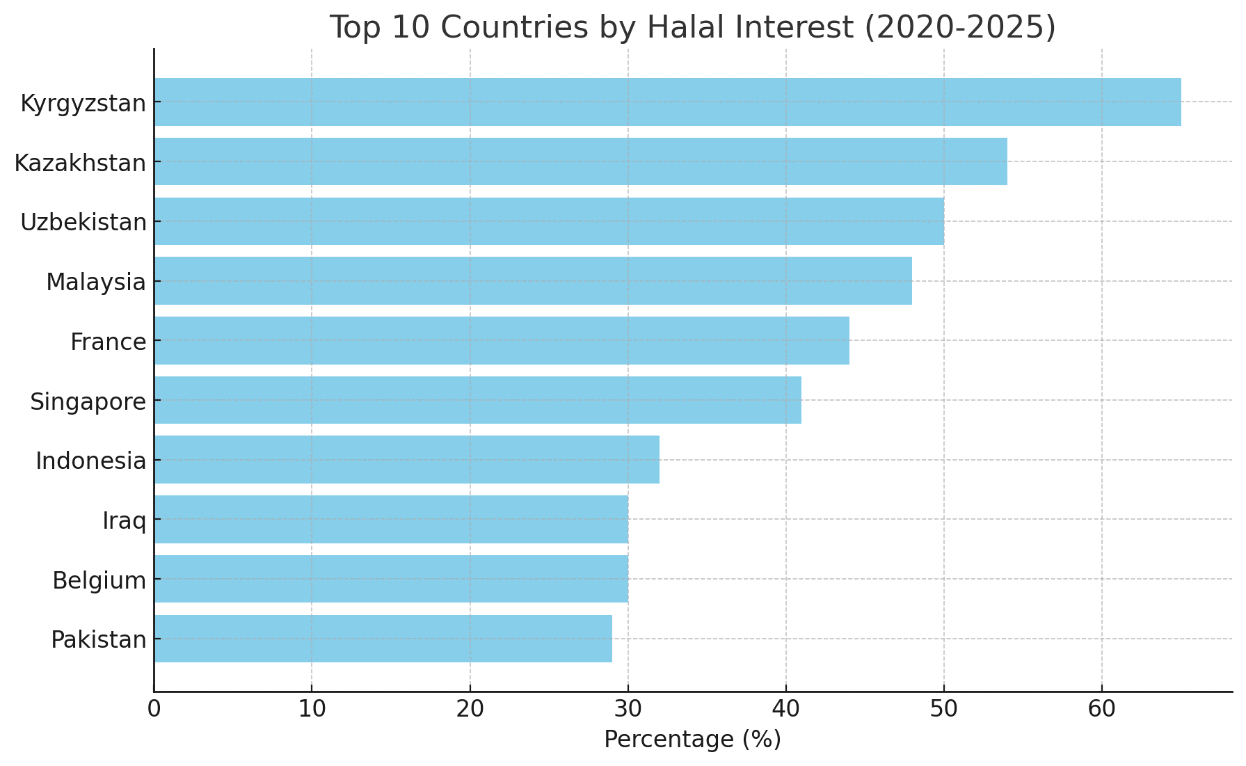 For many, the word halal is often associated only with Islamic dietary law. Yet Google Trends data shows that the topic is becoming broader and more global. In Muslim majority countries such as Malaysia, Indonesia, and Pakistan, halal accounted for a large share of searches relative to food and investment. However, some of the most surprising results come from outside the Muslim world. France recorded 44 percent of search interest in halal and Belgium reached 30 percent. This suggests that halal has grown into a conversation not limited to religious communities.
