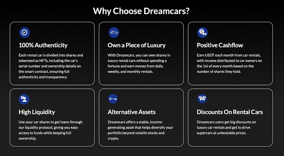 Dreamcars’ luxury car fleet is rented out for short-term and long-term use in cities like Dubai, and rental earnings are distributed back to NFT holders in USDT.