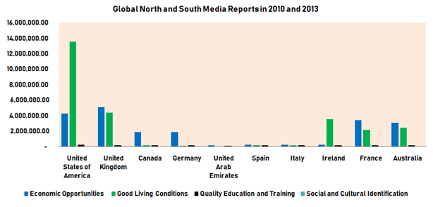 Our analysis shows that between 2010 and 2013 both the Global South and North media had a significant number of publications on economic opportunities in the United Kingdom, the United States of America, France, Australia, Germany and Canada. The USA, UK, France, Canada and Australia also featured prominently in publications on good living conditions, followed by Ireland. Under the financial stability reportage, USA, UK, Germany, Australia and France were above Canada. Analysis also indicates that USA, France, Canada, Ireland, Spain and Italy had significant publications that established quality education and training in 2010 and 2013. United Kingdom, Spain, Italy, United States of America, United Arab Emirates and Ireland were the top countries for the volume of publication in social and cultural identification. As the media report these happenings, analysis indicates that economic opportunities, better living conditions, quality education and training interested the public most.