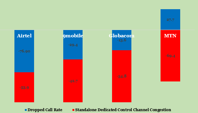 For the dropped call rate metric, there was no strong difference between MTN and Glo. A strong difference exists between MTN and Airtel. In this regard, Airtel was better than MTN in terms of less dropped calls. We also found a strong difference among MTN and 9Mobile [9Mobile is better in terms of less dropped calls], MTN and Glo [Glo is better than MTN], MTN and Airtel [MTN is better], and MTN and 9Mobile [MTN is better]. Analysis of difference for Standalone Dedicated Control Channel Congestion metric also reveals a strong difference between what MTN and Airtel recorded during the 12-months [however, Airtel is better], MTN and Glo [Glo is better], MTN and 9Mobile [9Mobile is better]. For traffic control, a strong difference exists between MTN and Airtel [however, Airtel is better], MTN and Glo [however, MTN is better], and MTN and 9Mobile [MTN is better].