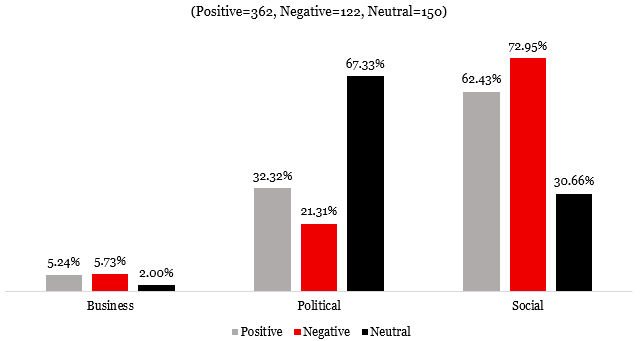 Among the influencers, business influencers seem to have the quietest footprint in the sentiment space. Their content accounts for just over 5 percent of both positive and negative sentiments, and an even lower percentage of neutral sentiment. This relatively low level of engagement suggests that business influencers are yet to fully harness the emotive power of digital platforms. Our analyst also notes that it may reflect the general public’s limited emotional investment in business-related content, or a tendency for business discourse to remain technical and reserved.