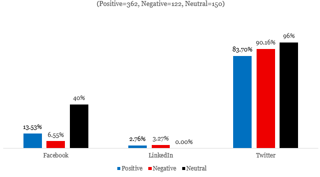 Facebook, by contrast, appears more balanced and subdued. It accounts for about 13 percent of positive sentiment, 6 percent of negative sentiment, and 40 percent of neutral sentiment. This suggests Facebook serves as a platform for longer discussions, community-oriented interaction, and moderate debate. It remains important, particularly for reaching diverse demographics, but does not match the emotional velocity of Twitter.