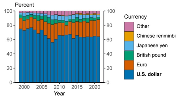 While the US dollar accounts for the lion’s share of international trade, a small subset of other currencies (renminbi, Euro, British Pound, Japanese Yen, and Swiss Franc) is also actively used in international trade alongside the U.S. dollar.