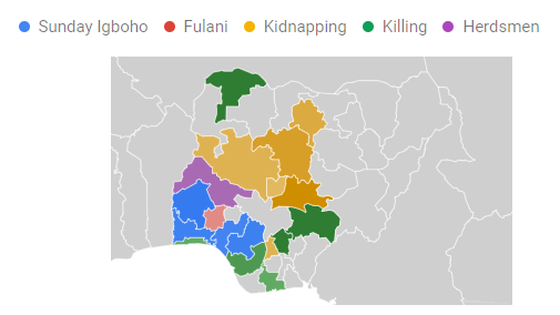 Analysis shows that Sunday Igboho was searched and understood through a number of information on the Internet between January 16 to January 23, 2021. The interest about him was high among the people in the Southern region than other regions in the country. Our analysis reveals that the higher the interest in knowing him, the lower people developed interest in Fulani, kidnapping, killing. This is quite different from their interest in him and herdsmen.