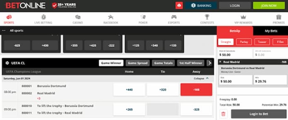 Like a $200 bonus for referring friends, VIP rewards, plus BetOnline already have some of the best Real Madrid vs Borussia Dortmund associated markets to support the main match odds – including betting on who will ‘lift the trophy’, spread, correct scores and goalscoring bets.