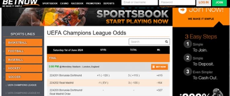 With BetNow you can place bets on the 2024 Champions League Final between Real Madrid and Borussia Dortmund in Florida with $1,000 in free bets due to their 100% welcome deposit bonus.