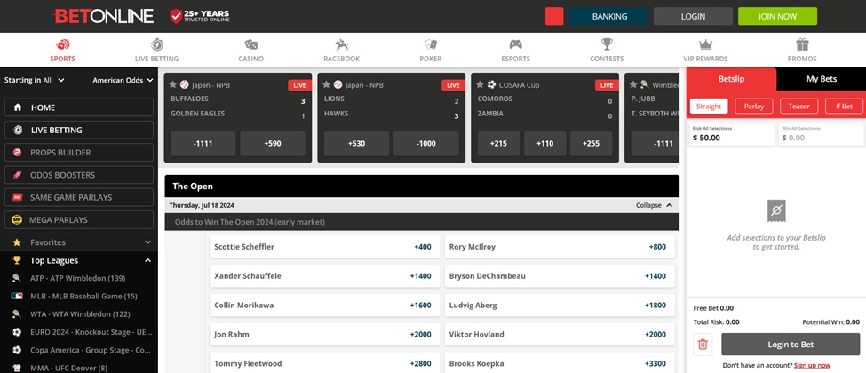 BetOnline is our top-ranked US offshore betting site. It has been supplying its customers with competitive odds for over 25 years. This makes it a perfect destination for anyone looking to bet on the 2024 Open Golf Championship this month.