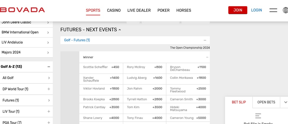 Scroll down a bit further and you’ll find the latest Open Golf Championship 2024 outright betting odds supplied by BetOnline.