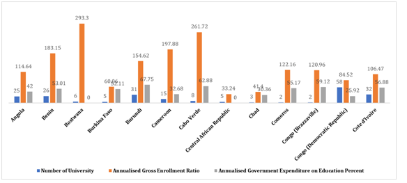 To understand the demand country by country on the continent, Angola, Benin Republic, Botswana, Burkina Faso, Burundi, Cameroon, Cabo Verde, Central African Republic, Chad, Comoros, Congo (Brazzaville), Democratic Republic of Congo and Cote D’Ivoire within sub-Saharan region were selected (as the first set of countries for analysis). Analysis reveals that some of these countries have prioritised the need to increase gross enrollment rate and education expenditure between 2012 and 2016 (the years data are available).
