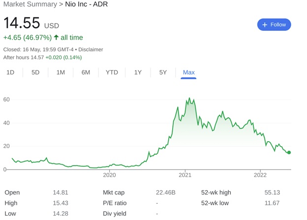 Nio stock went from $40 at the end of November to $20 by the end of January 2022. 2022 has been a rocky road for Nio shareholders so far. Stock is up nearly 47% over five years of trading and in Q1 2022 – Nio’s financial results presented a positive increase in deliveries, improved margins, and a rise in revenue.