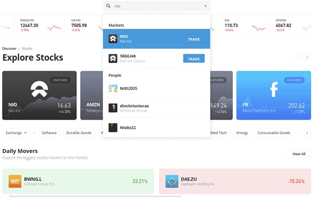 At this stage, you have created an eToro account from which to buy Nio stock and have funds to invest with. All you need to do now is type ‘Nio’ into eToro’s search bar.