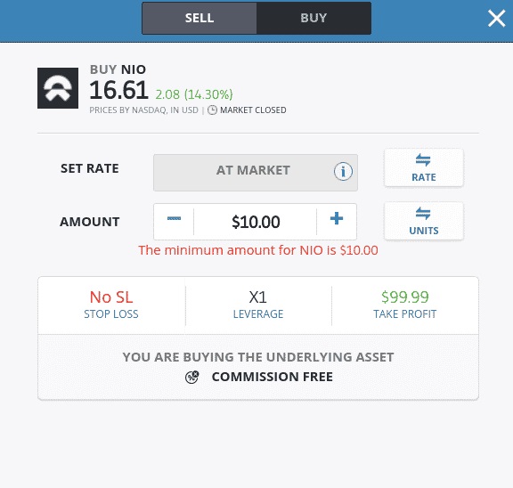 You will be able to buy fractional amounts of Nio stock. However, this is under the proviso that your chosen trading platform supports fractional investing. eToro enables US traders to risk just $10 or more on any stock – including Nio. Better still, all stocks are offered on a commission-free basis so you only have to pay the spread.