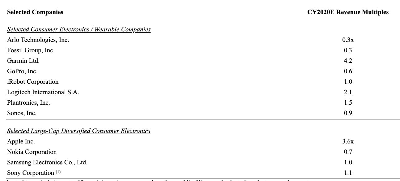 A long securities filing made public by Fitbit brought the true rejoinder to the AirPods silliness. The proxy form details Google’s $2 billion bid for the company and urges shareholders to vote in favor of the deal. It’s mostly pretty dull reading, but then you get to an eye-opening chart. Fitbit’s investment bankers drew up a list of comparable companies, like GoPro and its action cameras or Sonos with smart speakers, to help decide how much Fitbit might be worth. With only a few exceptions, these companies were trading at a bottom-of-the-barrel valuation of 1 times their sales or less.