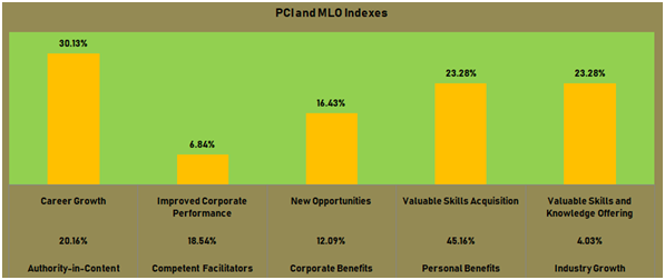 Career growth, valuable skills acquisition, and valuable skills and knowledge offering are used mostly within MLO Index, personal benefits, authority-in-content, competent facilitators are better than others within the PCI Index. These insights have many implications for the companies and the industry.
