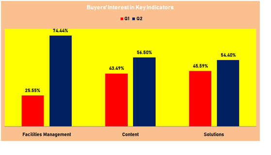 For instance, buyers’ interest in facilities management, content and solutions has been on the increase since Q1 2019. This signifies that players in the industry need to develop content that align with their solutions and disseminate them via LinkedIn and other channels. When the dissemination is done using LinkedIn and the employees share the content with the members of their network, analysis indicates that the social capital (employees’ presence) has the capability of increasing buyers’ interest in FM solutions by 26.3%, while the current brands’ connections can ensure 38.6% interest.