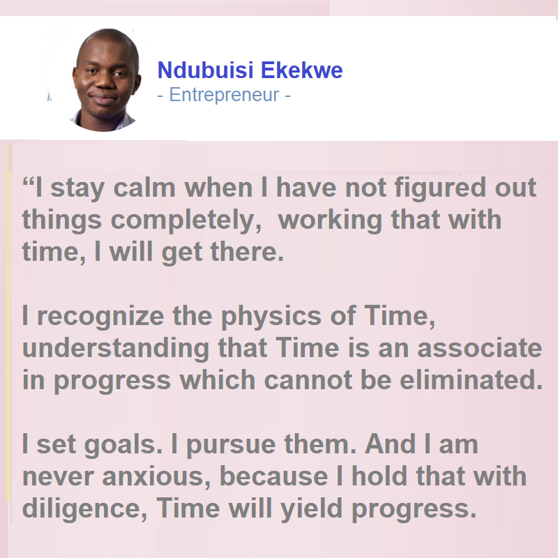 “I stay calm when I have not figured out things completely, working that with time, I will get there. I recognize the physics of Time, understanding that Time is an associate in progress which cannot be eliminated. I set goals. I pursue them. And I am never anxious, because I hold that with diligence, Time will yield progress”. #calm
