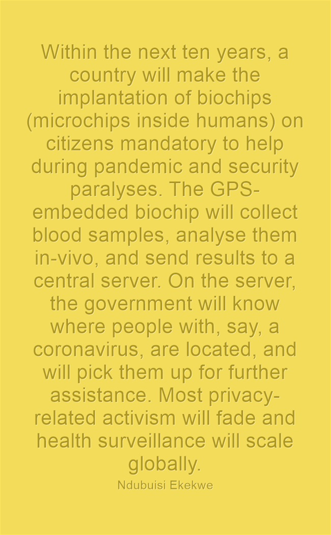 Within the next ten years, a country will make the implantation of biochips (microchips inside humans) on citizens mandatory to help during pandemic and security paralyses. The GPS-embedded biochip will collect blood samples, analyse them in-vivo, and send results to a central server. On the server, the government will know where people with, say, a coronavirus, are located, and will pick them up for further assistance. Most privacy-related activism will fade and health surveillance will scale globally. I invite you to read this piece which Isaac Thani shared with Tekedia; Bill Gates predicted this pandemic to the money!