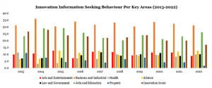 The Nigerian public consistently expresses a keen interest in the annual Global Innovation Index, prompting us to conduct an analysis of the country’s innovation scores from 2013 to 2022 along with their innovation information seeking behaviour. When it comes to seeking information on innovation, particularly with the goal of understanding innovation and potentially fostering innovative practices, the majority of inquiries were directed towards the business and industrial category throughout the entire analysis period with the different volume of searches [2013 (n=2679), 2014 (n=2416), 2015 (n=2621), 2016 (n=2494), 2017 (n=2366), 2018 (n=2119), 2019 (n=2645), 2020 (n=1833), 2021 (n=2280), and 2022 (n=2729)]. Following closely behind was the jobs and education category, which initially had a lower percentage of available information. Despite a substantial amount of information being accessible for arts and entertainment throughout the period, it emerged that people sought information in this category less frequently.