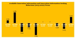 To increase our understanding of how the Nigerian public sought information between 2013 and 2022 in the context of the categories listed earlier, we further analysed the link between the availability of innovation information and innovation information-seeking behaviour. Our analysis reveals a -28% linkage. In this case, as the availability of innovation information increases, the level of innovation information-seeking behaviour decreases. On an individual level, this insight resonates with available innovation information and seeking behaviour from 2015 to 2021.