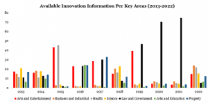 Utilizing the Google Search Engine, Nigeria’s and the world’s most widely used search platform, we discovered that there were 7.5 billion pieces of information related to innovation available for Nigeria between 2013 and 2022. Our analysis reveals that almost half (31.4%) of this information pertained to innovation within the field of law and government. Following closely at 25.3% of the total were arts and entertainment. Property accounted for 14.8%, and health comprised 10.5% of the information available. Jobs and education represented 7.9%, while science accounted for 4.8%, both totalling less than 10% of the overall information.