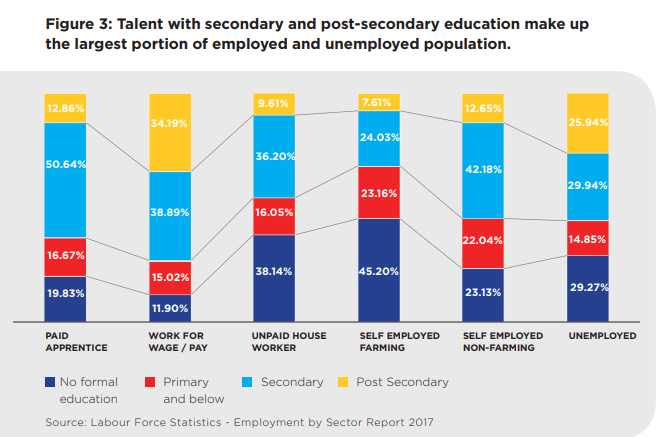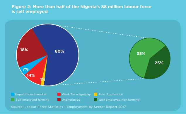 About 11.1 million out of the unemployed 20.9 million are involved in one form of work or the other with most of them involved in small and medium scale enterprises in the agriculture and small scale retail businesses. Overall, only 25% of the workforce is engaged in paid employment while half of the workforce has either just primary education or no formal education.