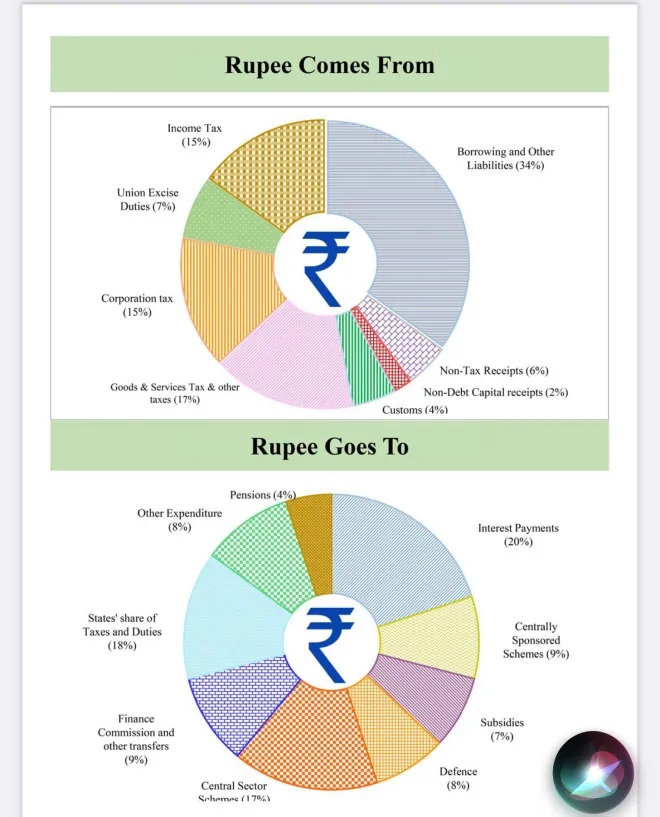 20% of the India’s budget is spent on interest expenditure while 34% of the budget is funded from borrowings. That means of every 1 Rupee borrowed, 59 paise go to interest payments on previous debt.