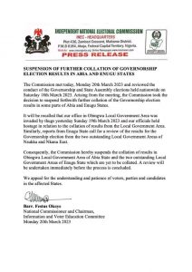 “The Commission met today, Monday 20th March 2023 and reviewed the conduct of the Governorship and State Assembly elections held nationwide on Saturday 18th March 2023. Arising from the meeting, the Commission took the decision to suspend forthwith further collation of the Governorship election results in some parts of Abia and Enugu States.