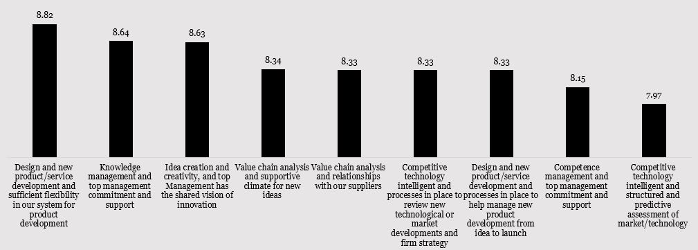 For the veracity of our propositions, we used Alpha Mead Facilities, one of the key players in the industry as the basis of understanding the key constructs in the propositions. Other players could follow the path of the company in the areas of design and new product/service development, knowledge management, idea creation and creativity climate. In our analysis, these areas consistently have above 8 points out of the expected 10 points when they were analysed along with sufficient flexibility in system for product development, top management commitment and support towards innovation, idea creation and creativity, top management shared vision of innovation and supportive climate for new ideas respectively [see Exhibit 3].