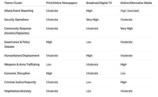 Online and alternative platforms, including blogs and citizen-reporting sites, complement the system by covering community-level realities. Their reports on vigilante groups, displaced persons, and illicit trade networks highlight aspects of banditry that mainstream outlets often miss. This digital ecosystem extends the intelligence perimeter by giving visibility to micro-incidents and informal actors that shape the security terrain.