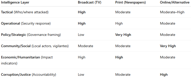 When viewed collectively, Nigerian media outlets form a distributed intelligence network. Print media offer strategic insights into governance and policy patterns, television delivers operational updates, and online channels reveal local dynamics.